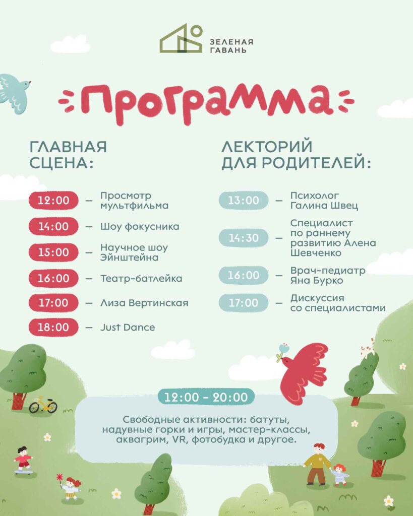 На главной сцене пройдут мероприятия и активности для детей. С 12:00 начнется просмотр популярного мультфильма, а в 14:00 стартует выступление фокусника. В 15:00 покажут увлекательное детское научное шоу профессора Эйнштейна. Чуть позже выступят артисты театра-батлейки и певица Лиза Вертинская, а завершится вечер в 20:00 зажигательными танцами с Just Dance. Параллельно на площадках будут работать творческие мастер-классы.