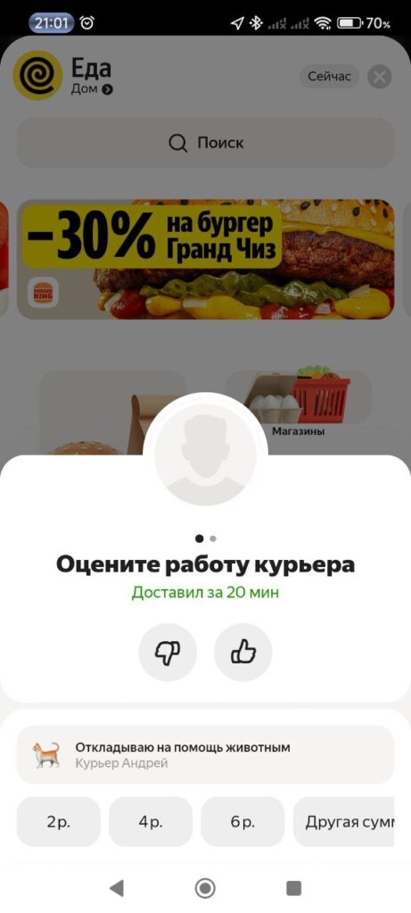 Оставить чаевые за заказ можно, выбрав удобную сумму из предложенной или ввести свое значение вручную. Чаевые поступят курьеру в полном объеме, комиссию с них сервис не удерживает.