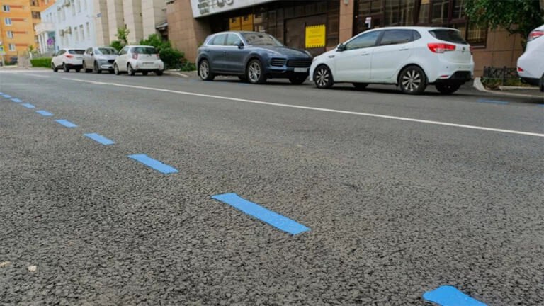 В экспериментальном порядке в столице зоны платной парковки обозначат разметкой 1.8 синего цвета. Использовать при этом будут не только эмаль, но и пластик.
