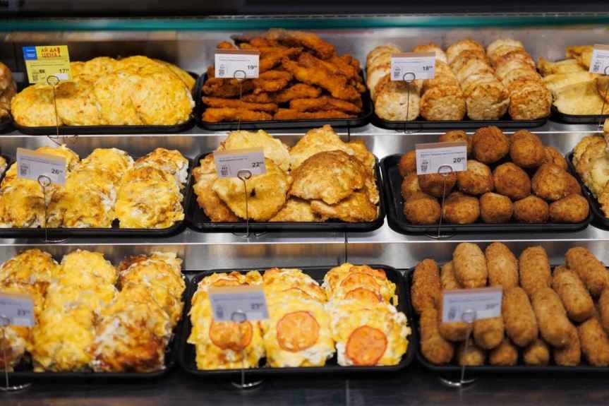Выпечка поступает на прилавок еще теплой. Из собственного производства – полуфабрикаты и готовые блюда – от котлет до сырников и роллов.