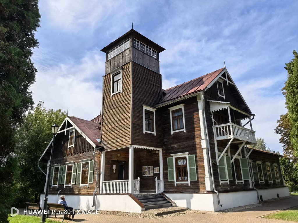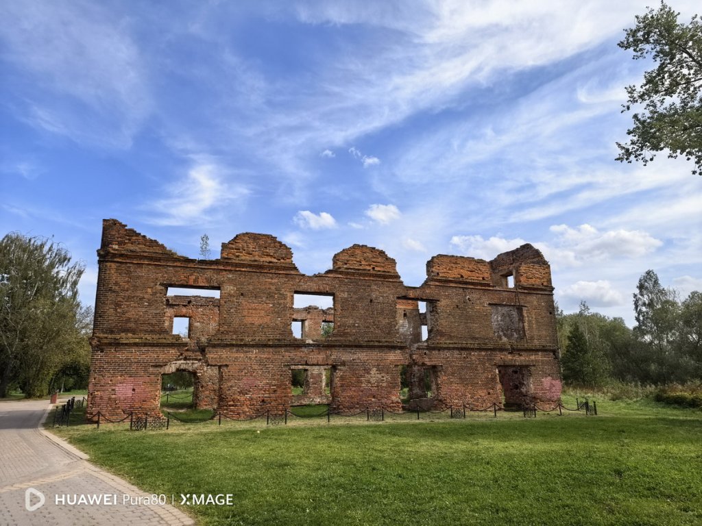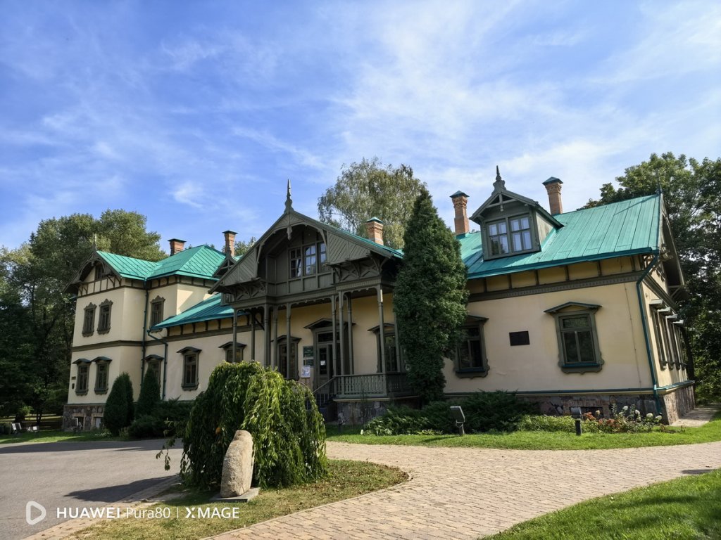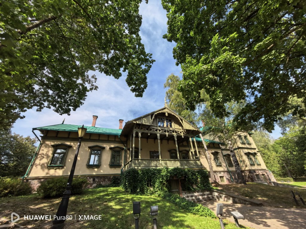Так выглядит Лошицкая усадьба с обратной стороны. Этот снимок мы сделали с помощью 13-мегапиксельного широкоугольного модуля с диафрагмой f/2.2, который позволяет охватывать широкую область пространства перед собой, не отходя далеко. В Huawei Pura 80 он тоже прекрасно справляется со своей задачей, обеспечивая при этом высокую детализацию и четкость картинки.