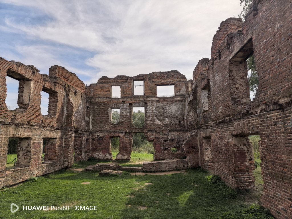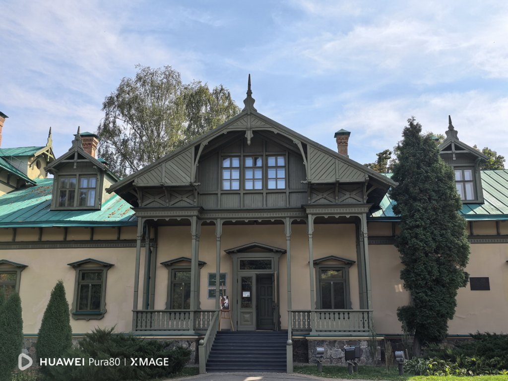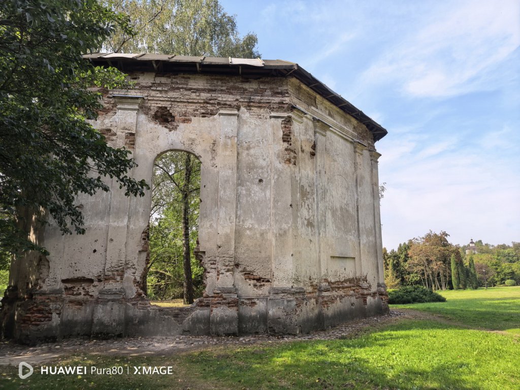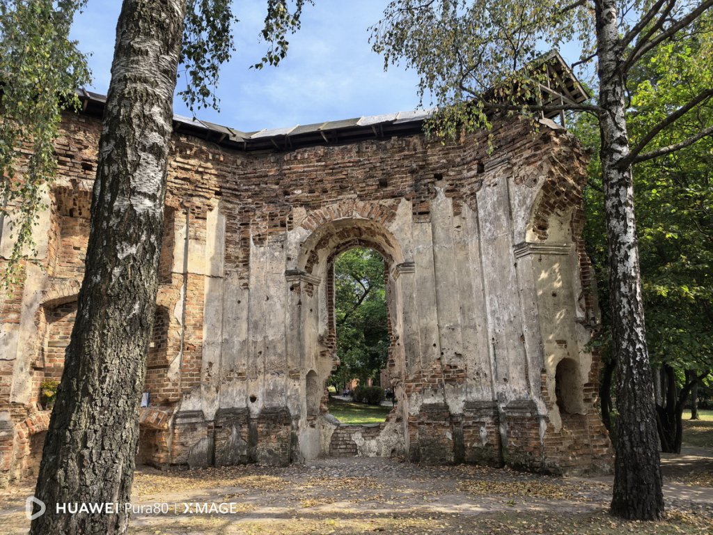 Так выглядит Лошицкая усадьба с обратной стороны. Этот снимок мы сделали с помощью 13-мегапиксельного широкоугольного модуля с диафрагмой f/2.2, который позволяет охватывать широкую область пространства перед собой, не отходя далеко. В Huawei Pura 80 он тоже прекрасно справляется со своей задачей, обеспечивая при этом высокую детализацию и четкость картинки.