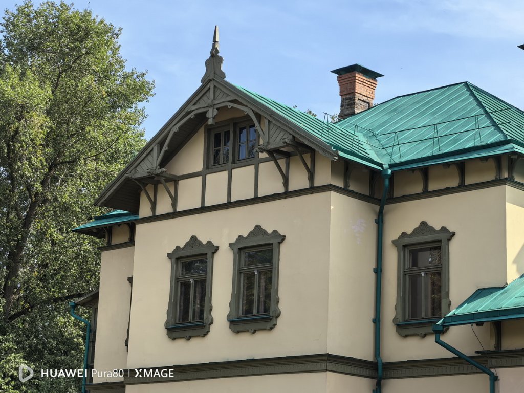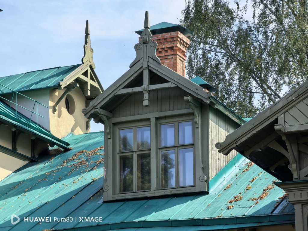 Основное здание усадьбы было возведено еще в XVIII веке, а затем перестроено в 1895 году. Воспользовались перископическим объективом на 12 Мп, чтобы рассмотреть особенности старинной архитектуры поближе. Собственно, для этого он и предназначен – приближать объекты, которые находятся далеко. А оптический зум Huawei Pura 80 поддерживает солидный – 5,5-кратный.