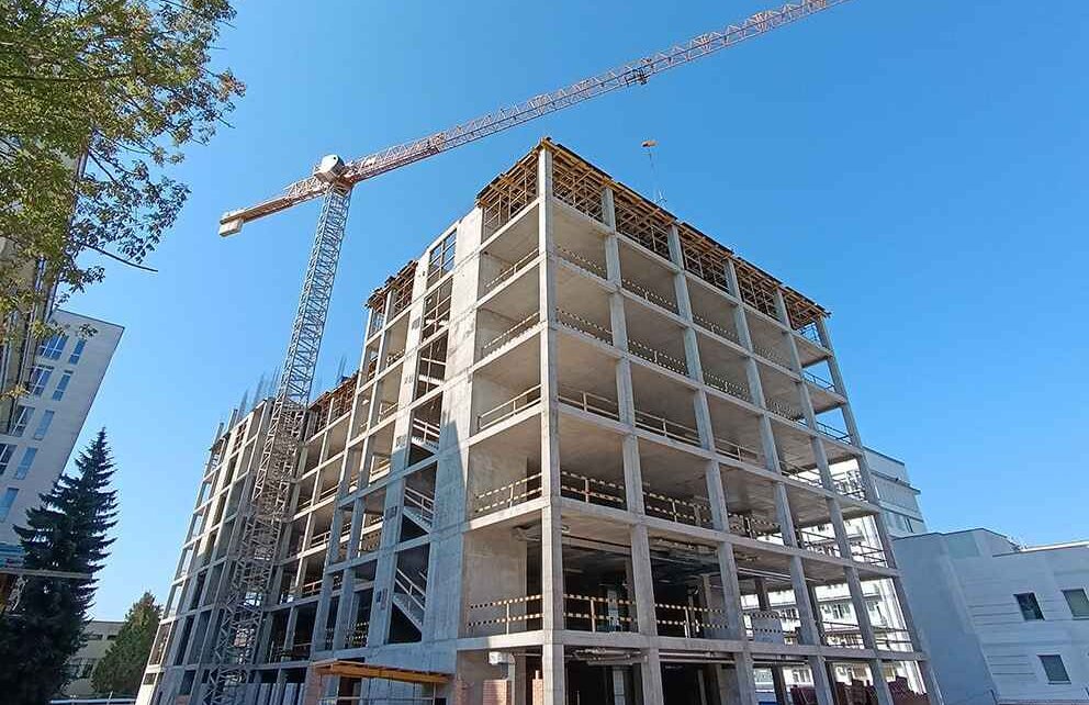 На проспекте Независимости в столице новый онкоцентр растет прямо на глазах. Монолитчики уже перекрыли седьмой этаж.