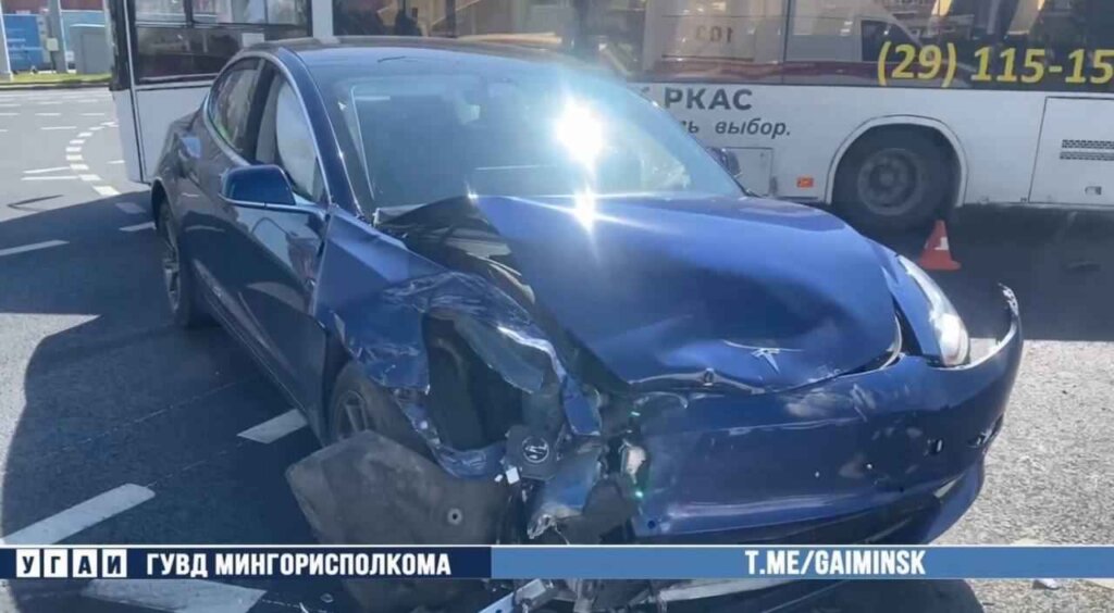 На пересечении улицы Сергея Есенина и проспекта Дзержинского произошло столкновение автомобилей «Tesla» и «Toyota». Предположительно Tesla проехала на красный сигнал светофора и врезалась в бок внедорожника.