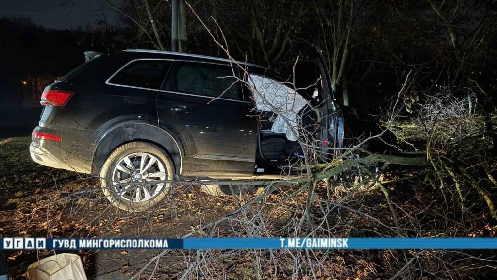 Ночью в столице произошло смертельное ДТП, 50-летний водитель автомобиля «Audi» на пересечении проспекта Машерова и переулка Канатный выехал за пределы проезжей части, врезался в осветительную мачту и дерево.