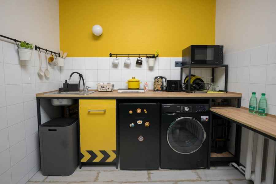 В хостеле «128» высокоскоростной Wi-Fi, по 2 розетки возле каждого спального места, стиральная машина, микроволновка, холодильник, бойлер, душевые кабины, проектор.