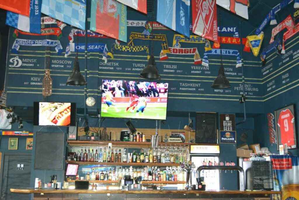 В спорт-баре потолок и стены украшены флагами и шарфами футбольных клубов из разных стран мира. Более 238 каталов для трансляций спортивных матчей.