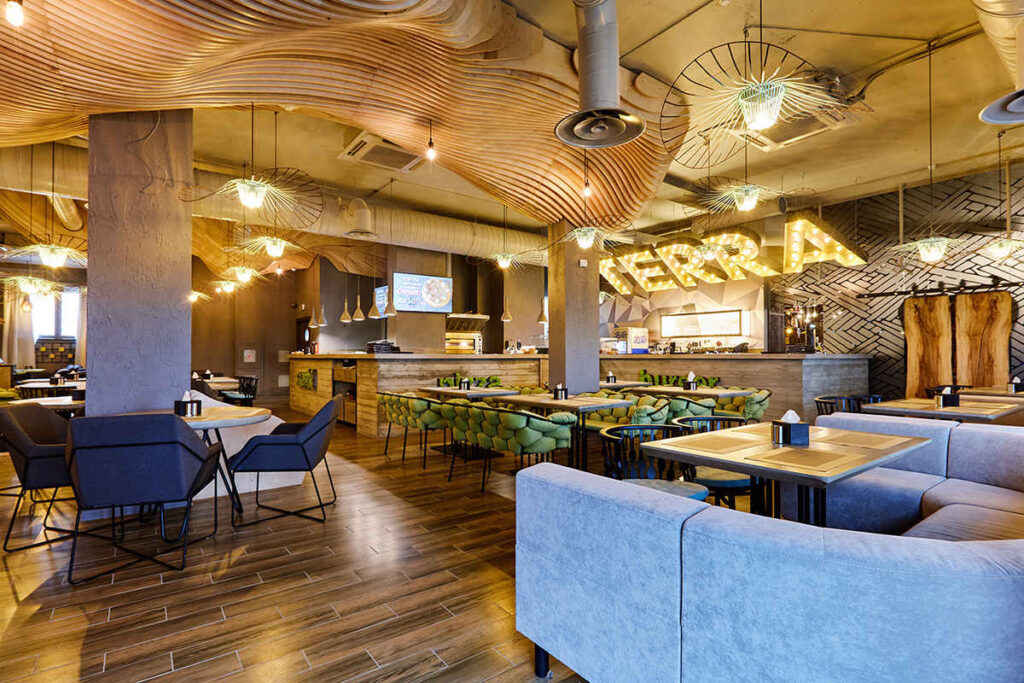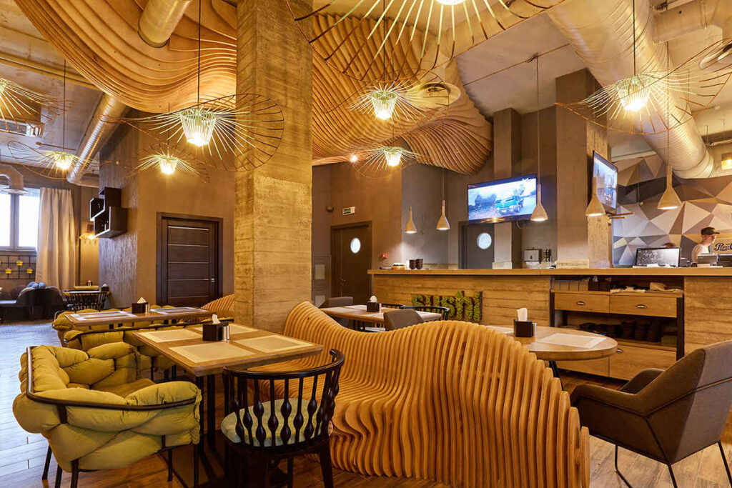 Ресторан отличается интересным дизайном, центральным элементом которого являются футуристические 3D-конструкции, плавно переходящие в уютные скамейки. В ресторане много мягких дизайнерских диванов, на которых будет приятно отдохнуть.