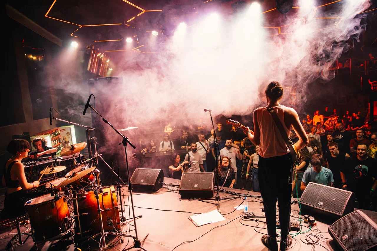 Большая профессиональная сцена, второй обзорный этаж со столиками, контроль на входе и добрые организаторы.